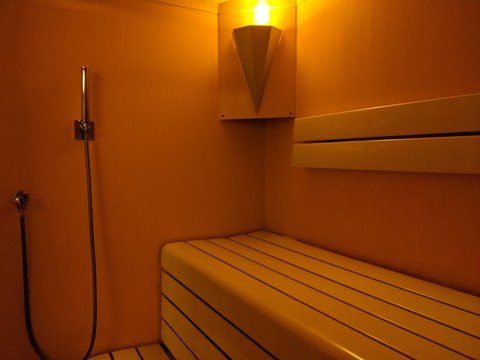 Es ist nicht so heiß, die Temperatur beträgt nur ca. 45 °C, dafür ist es aber sehr feucht mit einer Luftfeuchtigkeit bis zu 100%. Das feuchte Raumklima im Dampfbad ist ideal für die Reinigung von Haut und Atemwegen.
